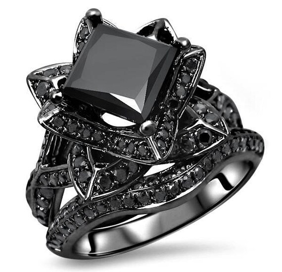 3 0ct Black Diamond Lotus Flower Engagement Ring Wedding Set Etsy